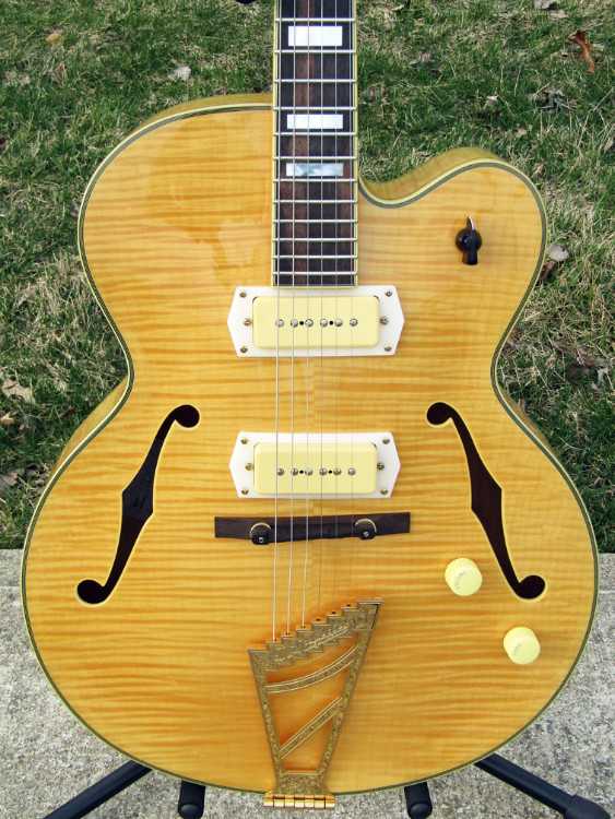 - Modern version of the classic 1959 John D'Angelico design, full hollow body, Seymour Duncan "Great Dane" P-90 pickups for diverse tones (jazz to rock), gold hardware (stairstep tailpiece) and vintage-style controls like chickenhead switch and cupcake knobs, built for versatile playability with its comfortable neck and jumbo frets